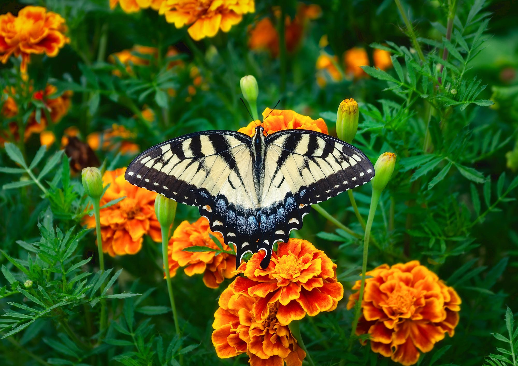 Trees, marigolds are